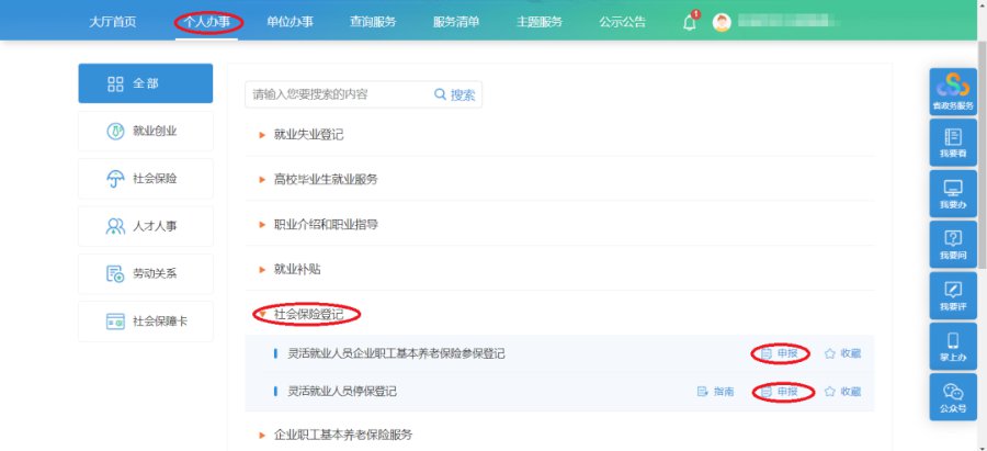 注册并且实名认证江苏智慧人社app进入主页,点击【全部】,再点击【社会保险】一栏,选择【灵活就业人员企业职工基本养老保险参保登记】或【灵活就业人员停保登记】进行申报。