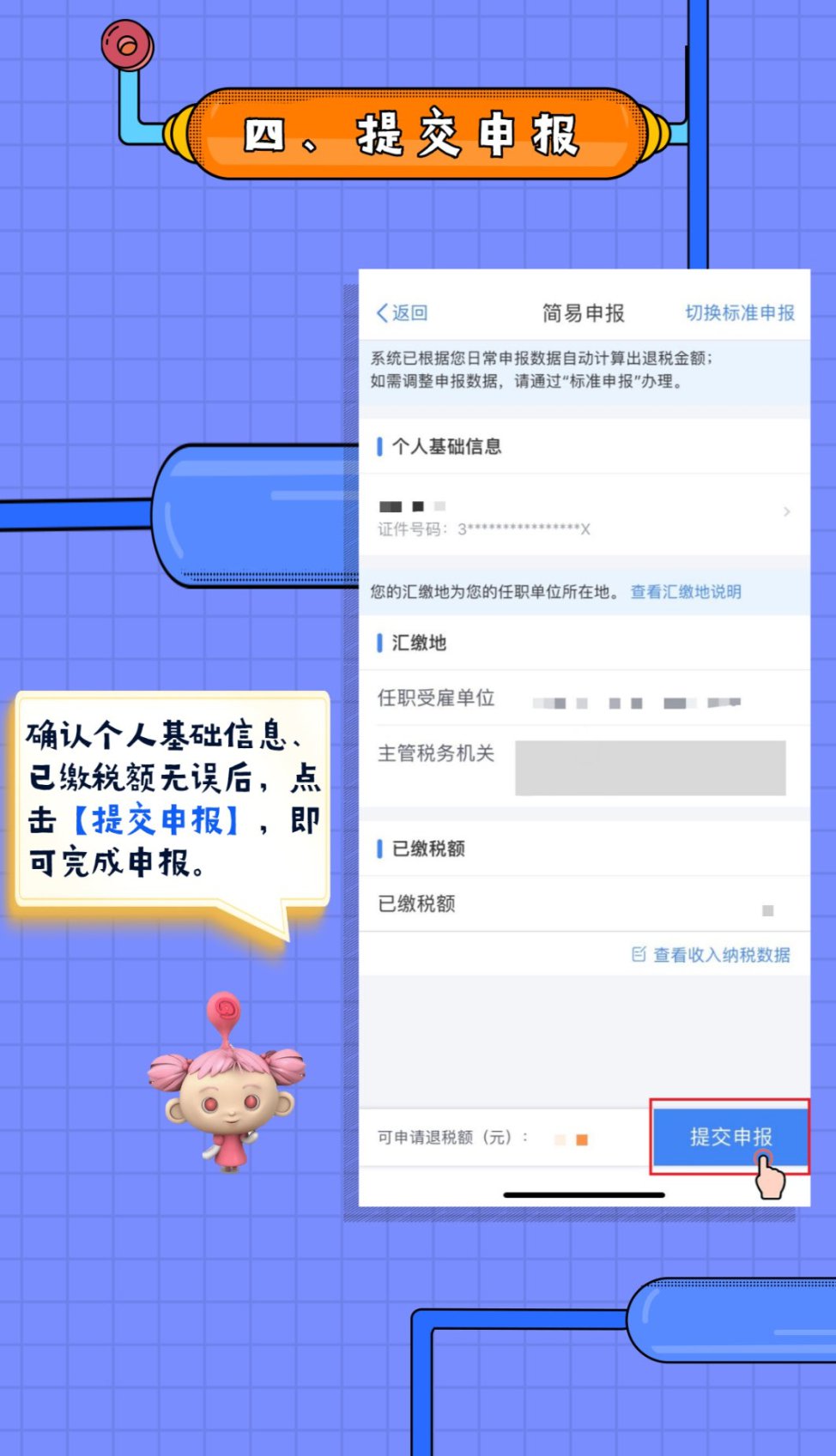 4.确认个人基础信息.已缴税额无误后,点击[提交申报],即可完成申报。