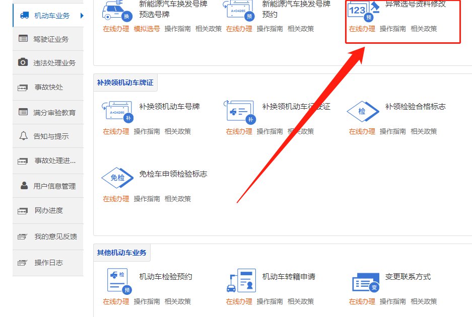 办理流程:用户登录办理平台后,点击【机动车业务】→【异常选号资料修改】进入异常选号资料修改流程。