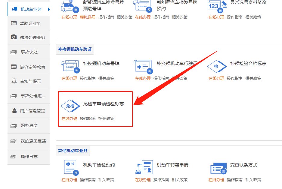 办理流程:用户登录办理平台后,点击【机动车业务】→【申领免检标志】,可以为已备案本人机动车在线申领免检标志。