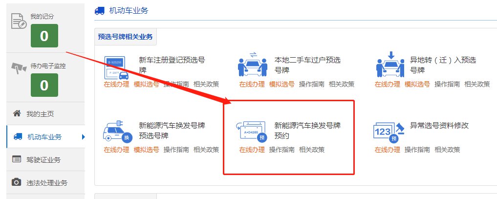 1、在换牌预约前,请先办理新能源汽车换牌选号业务。