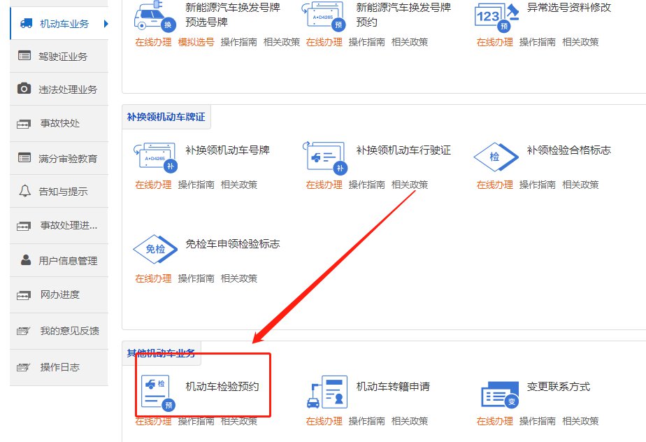 办理流程:登录办理平台后,点击【机动车业务】→【机动车检验预约】进入机动车检验预约业务流程。通过该功能只可以为自己名下绑定机动车进行检验预约。