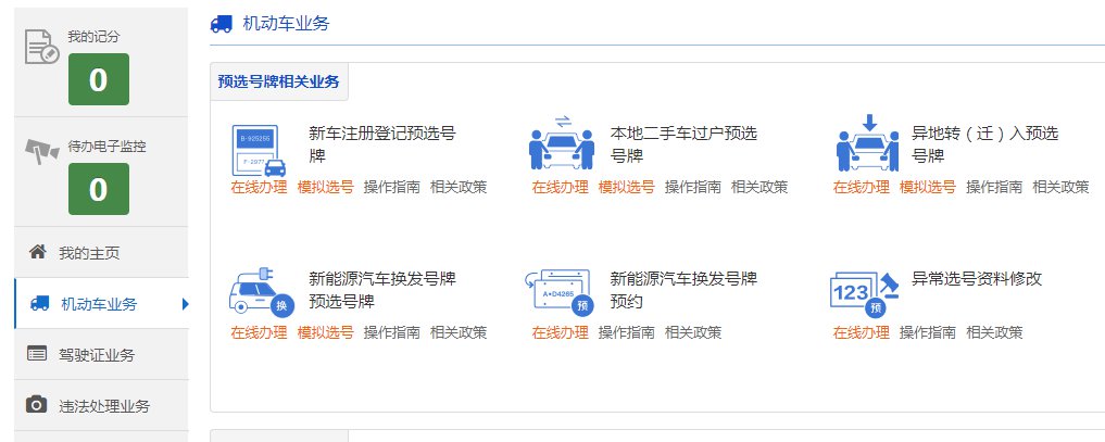 办理流程:在办理平台登录后,点击【机动车业务】→【新车(含新能源汽车)注册登记预选号牌】下的【预选号牌】进入预选号牌流程。