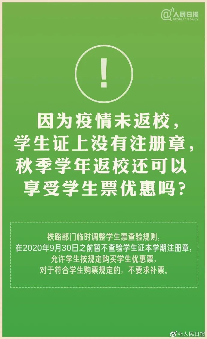 铁路部门回应因疫情未返校学生证无注册章:临时调整学生票查验规则,在2020年9月30日之前暂不查验学生证本学期注册章,允许学生按规定购买学生优惠票,对于符合学生购票规定的,不要求补票。