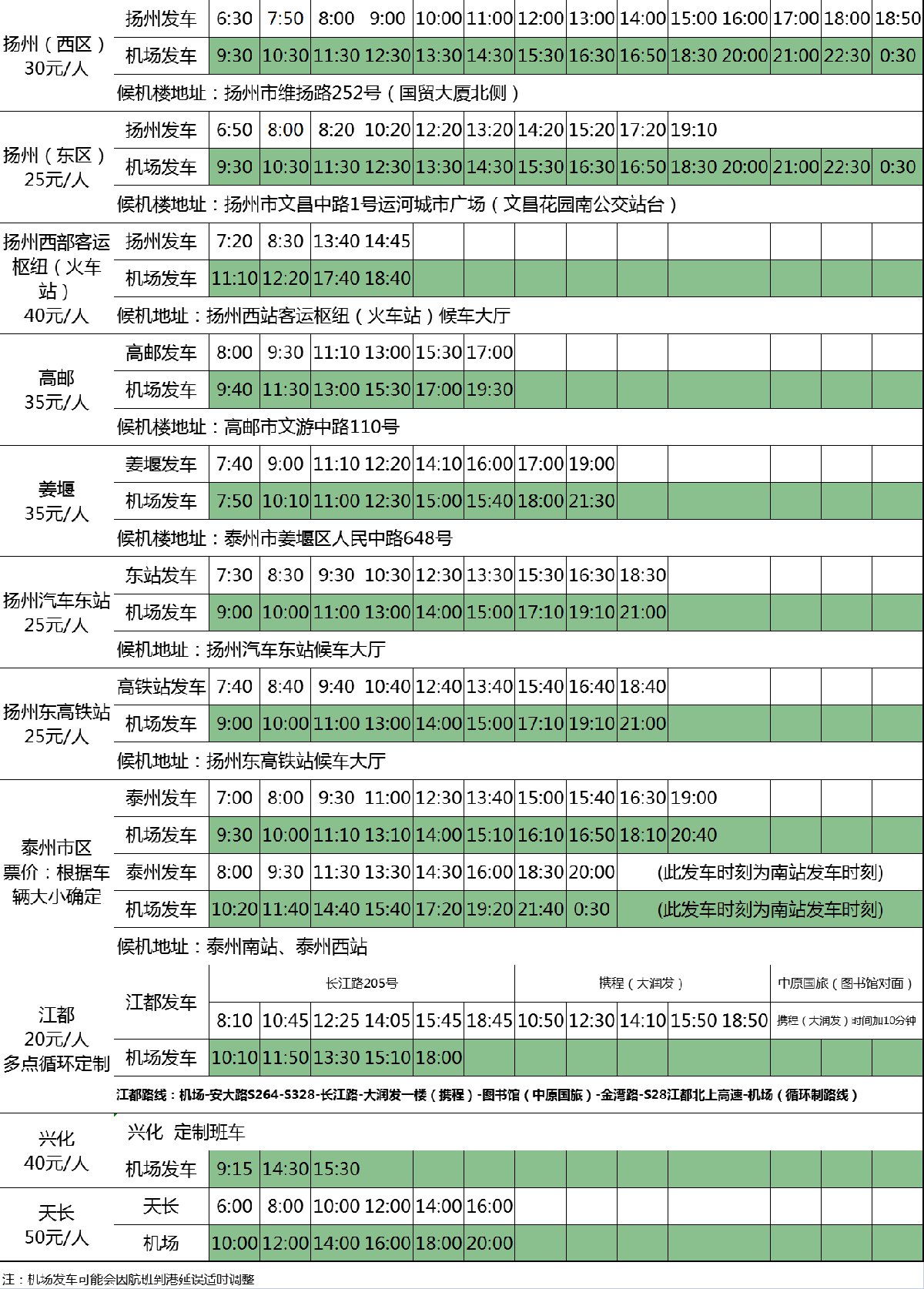 注:机场发车可能会因航班到港延误适当调整。