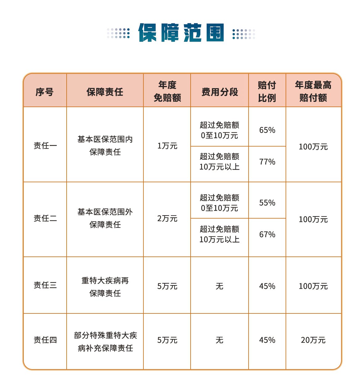 以第1项“基本医保范围内个人自付的部分”保障责任为例,其中10万元以下个人自付医疗费用赔付比例65%,10万元以上个人自付医疗费用赔付比例提高12个百分点,这样设置可以更大力度减轻高额医疗费用负担,防止出现家庭灾难性支出。