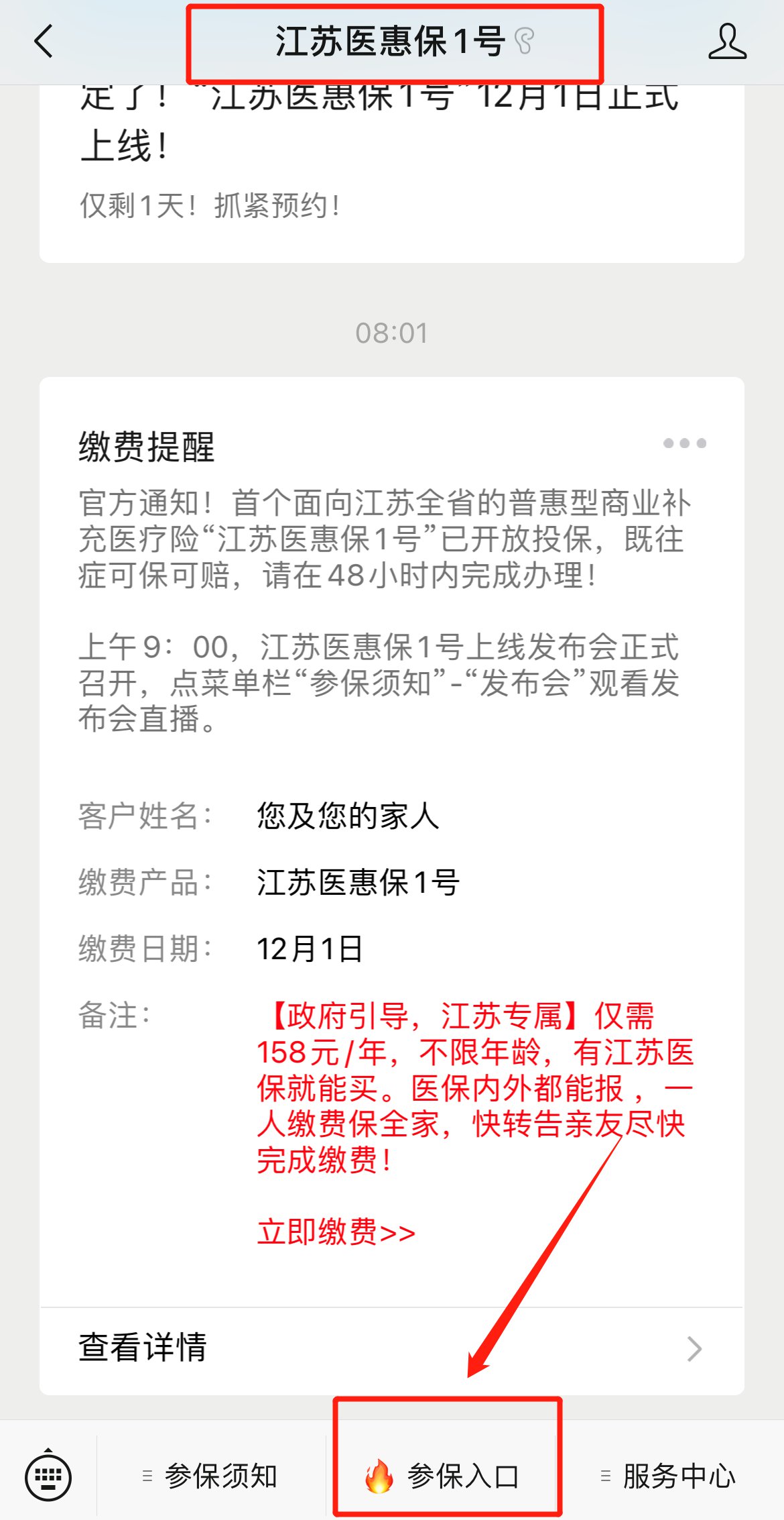 1.进入“江苏医惠保1号”微信公众号,点击下方“参保入口”