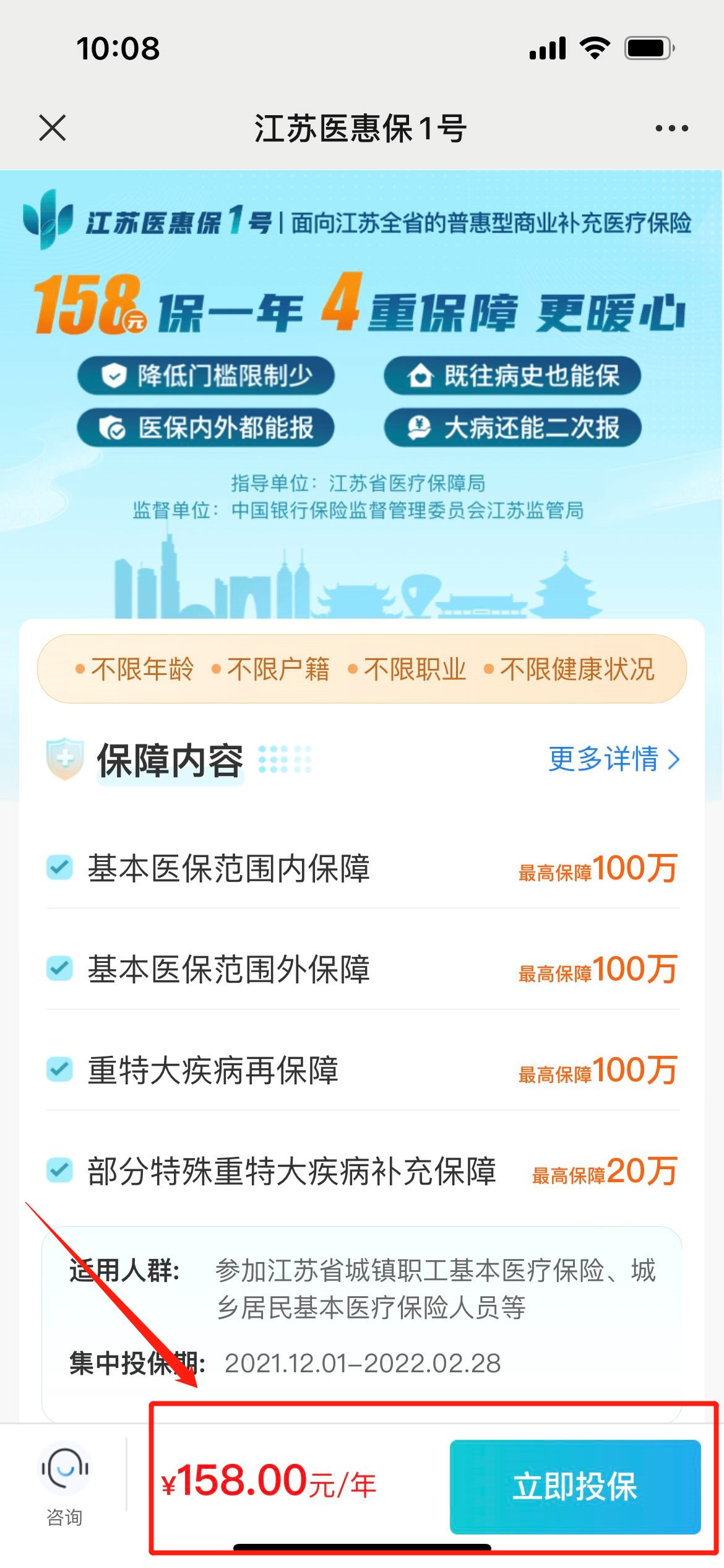 价格:江苏医惠保1号2022年度保费为158元。
