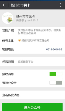 1、关注"扬州市市民卡"微信公众号,搜索或者扫描二维码;