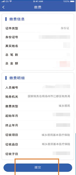 “缴费”页面查看缴费明细,确认无误后点击“提交”。