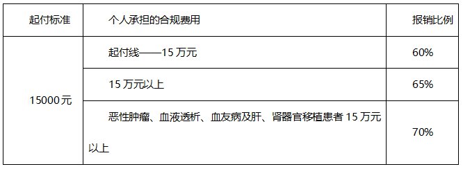 大病保险合规可报销费用=城乡居民基本医保报销后个人承担的合规医疗费用—起付标准。大病保险起付标准暂定为15000元,实行累加补偿,不设最高支付限额。参保困难人员大病保险起付标准降低50%,报销比例按段增加5个百分点。