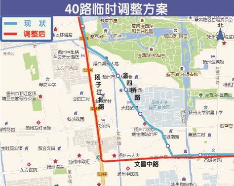 2、40路由蜀冈公交首末站始发,按原线路行驶至扬子江北路与念四桥路交叉口后,临时改道扬子江北路、文昌中路通行,上下行线路走向一致。临时撤销市公共法律服务中心(扬诚公证处)、念四桥路、扬大师院西门、扬大师院4站,新增瘦西湖西门(东方百合园)、念四新村、梅庄新村、人民大厦(中医院)、西门5站。