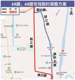 一、68路、68路专线分别由大马桥、扬州港始发,按原线路行驶至施桥北路与施沙路交叉口后,临时改道施沙路、临江路通行,上下行线路走向一致。临时撤销施桥北路施沙路、施桥镇、施桥镇北、施桥镇政府、施桥船闸、汪扬路、耿管营、油库、吴楼、亲亲冷冻市场、食品产业园11站,新增施桥汇春园、姚汪庄、花园庄、戴巷、临江路江海路、扬子郊野公园、临江路吴州东路、七二三所新区东、中意二手车市场(芯光能源)9站。首末班时间不作调整。