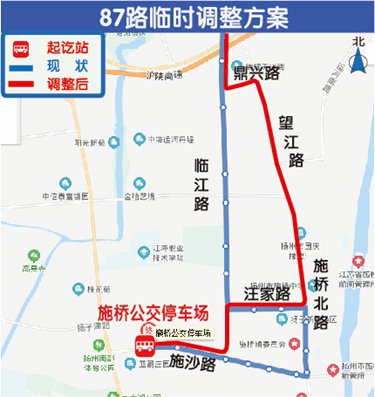 二、87路由施桥公交停车场始发,按原线路行驶至临江路与施沙路交叉口后,临时改道临江路、汪家路、施桥北路、望江路、鼎兴路通行,上下行线路走向一致。临时撤销花园庄、姚汪庄、施桥汇春园、施桥北路施沙路、施桥镇、施桥镇北、戴巷、临江路江海路、扬子郊野公园、临江路吴州东路、七二三所新区东、中意二手车市场(芯光能源)12站,新增戴巷(广陵新城公交首末站始发方向停靠)、施桥镇政府、施桥船闸、汪扬路、耿管营、油库、吴楼、亲亲冷冻市场、食品产业园9站,调整扬子新苑A区、扬子新苑C区2站上下行方向。首末班时间不作调整。