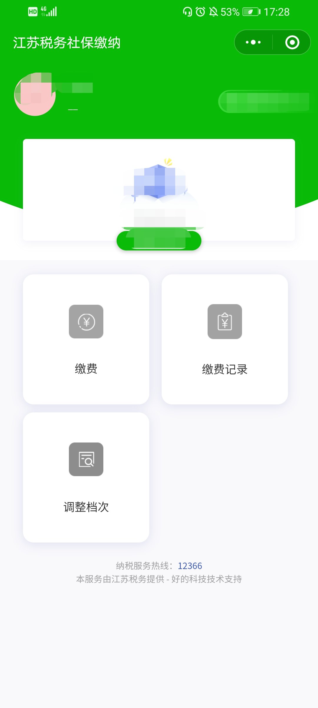 2、纳税人进入该功能后,跳转微信小程序【江苏税务社保缴纳】,纳税人可缴纳社保费用、查询社保缴费记录、调整社保缴费档次。