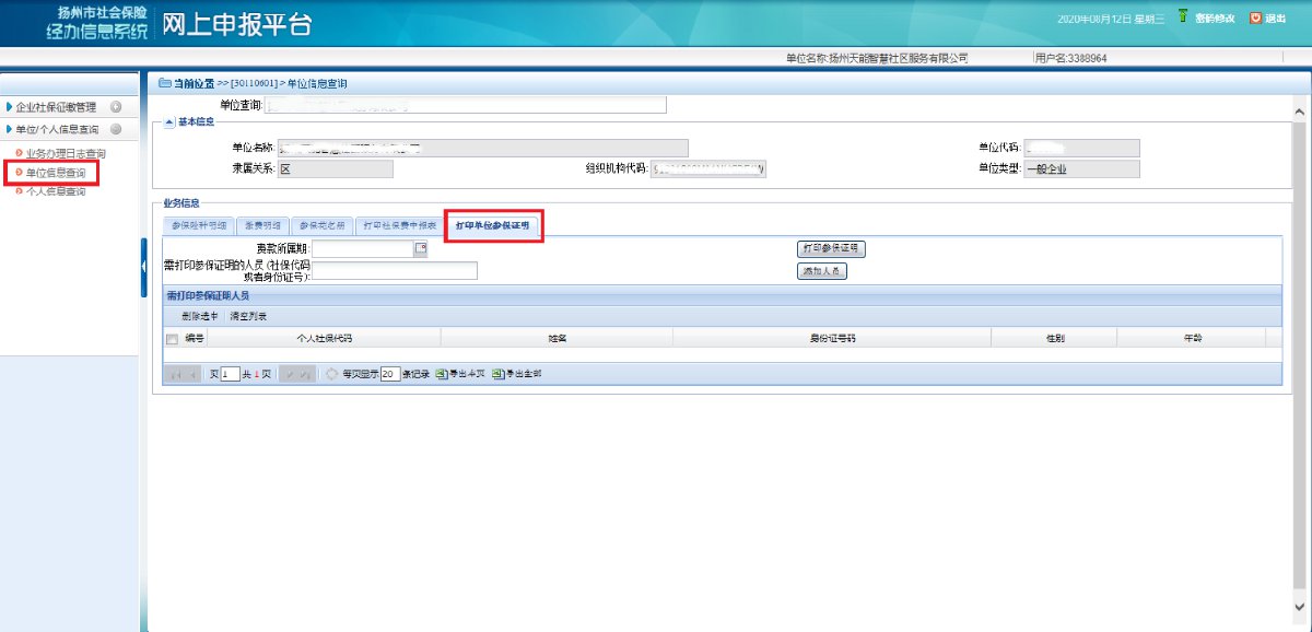 步骤二:点击“单位信息查询”——“打印单位参保证明”,添加所要打印人员,如下图: