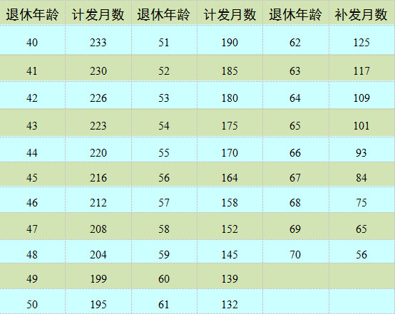 计发月数与退休年龄对照表如下: