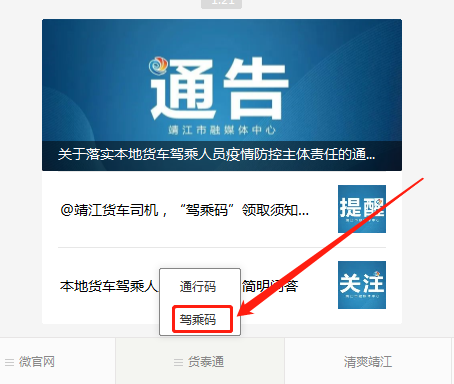 前期已在社区申报或者合作企业已经登记的本地驾乘人员,需进入“靖江发布”微信公众号,点击“货泰通—驾乘码—查询”