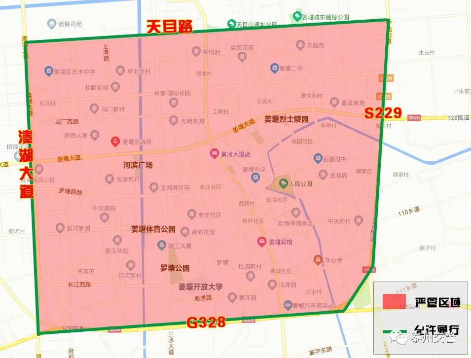 G328(姜堰段)以北、天目路以南、S229(姜堰段)以西、溱湖大道以东形成的封闭区域,上述道路允许正常通行。