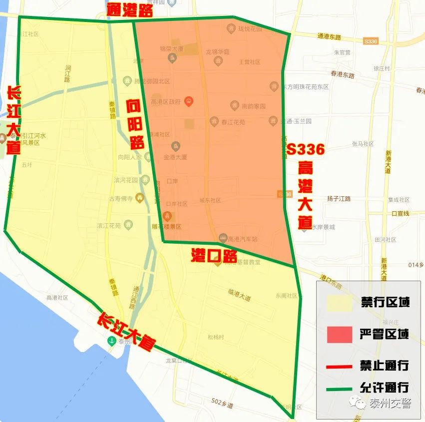 周山河路以北、引凤路以西、鼓楼路以西、东进路以南、青年路以东、泰州大道以东,禁行区域包括上述道路;