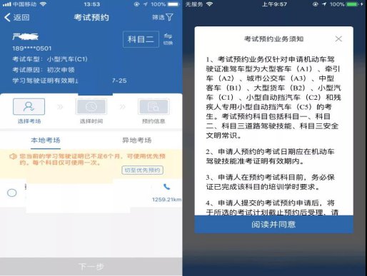 进入考试预约功能后,页面上部会显示考生用户的简项信息。用户可以点击考试科目按钮,切换其他科目进行约考,这里要特别提醒大家,符合优先约考的考生,也是在这里点击【切至优先预约】进行约考。选择考试地点,认真阅读考试预约业务须知后,点击【阅读并同意】,进入【选择考试场次】信息选择页面。