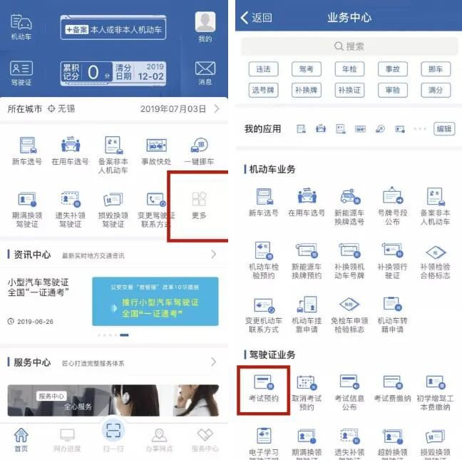首先,登录“交管12123”APP后,点击【业务中心】中的【考试预约】模块,进入到考试预约业务流程。