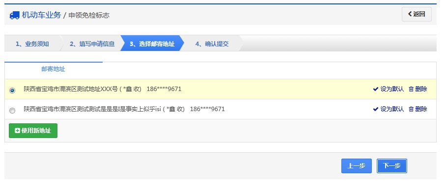 对于交强险和车船税未联网或核查失败的,用户需提交交强险凭证、车船税凭证照片,点击【下一步】,进入步骤3【选择邮寄地址】。