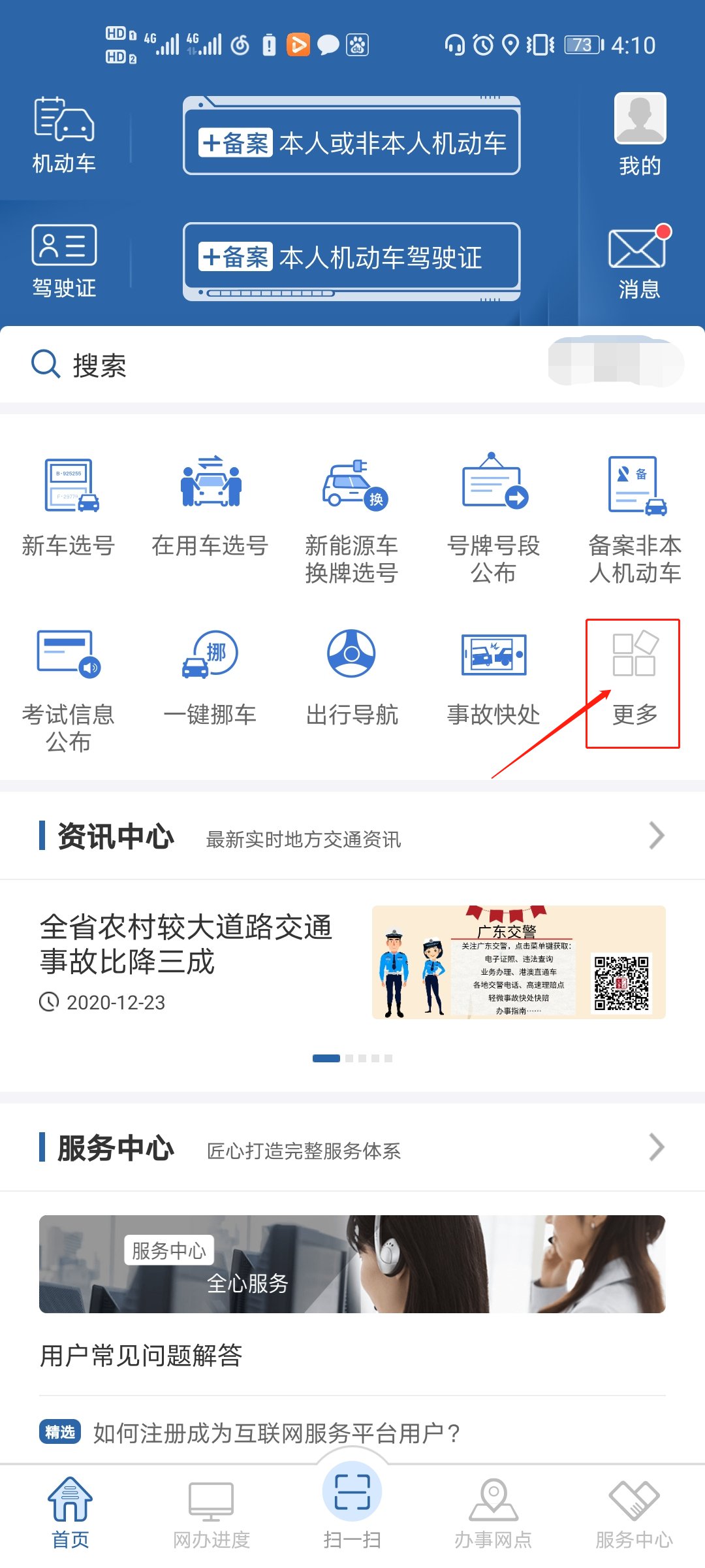第一步:下载“12123交管”APP,打开首页,注册登录后,点击“更多”功能按钮;