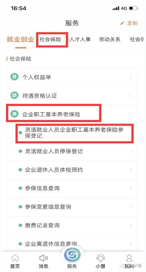 注册登录后,点击“服务”,选择社会保险→企业职工基本养老保险→灵活就业人员企业基本养老保险参保登记。