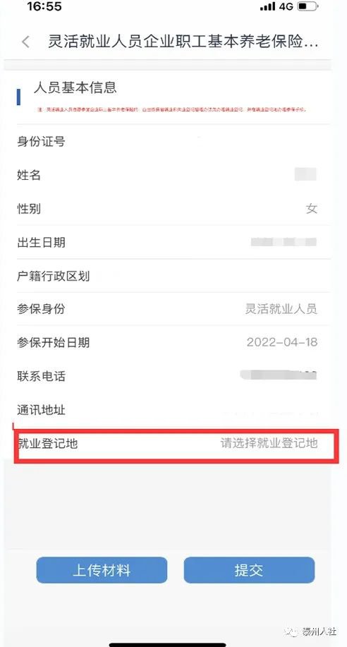 最下面选择就业登记地(即缴费地),然后点击上传材料,只需要在居民身份证件上传后点击提交即可。