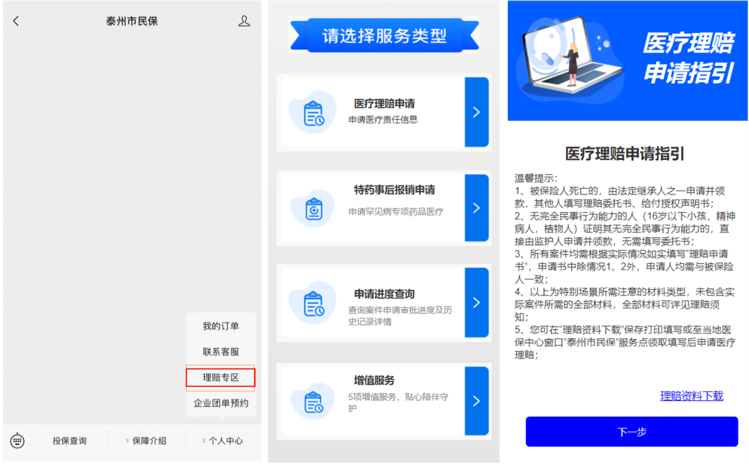 1. 通过公众号“泰州市民保”右下角-个人中心进入理赔专区进行理赔申请。