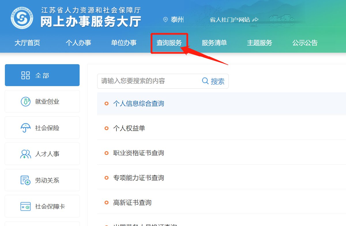 在泰州市人力资源和社会保障局官网首页点击“办事服务”——“人社网上办事大厅”,即可进去查询入口