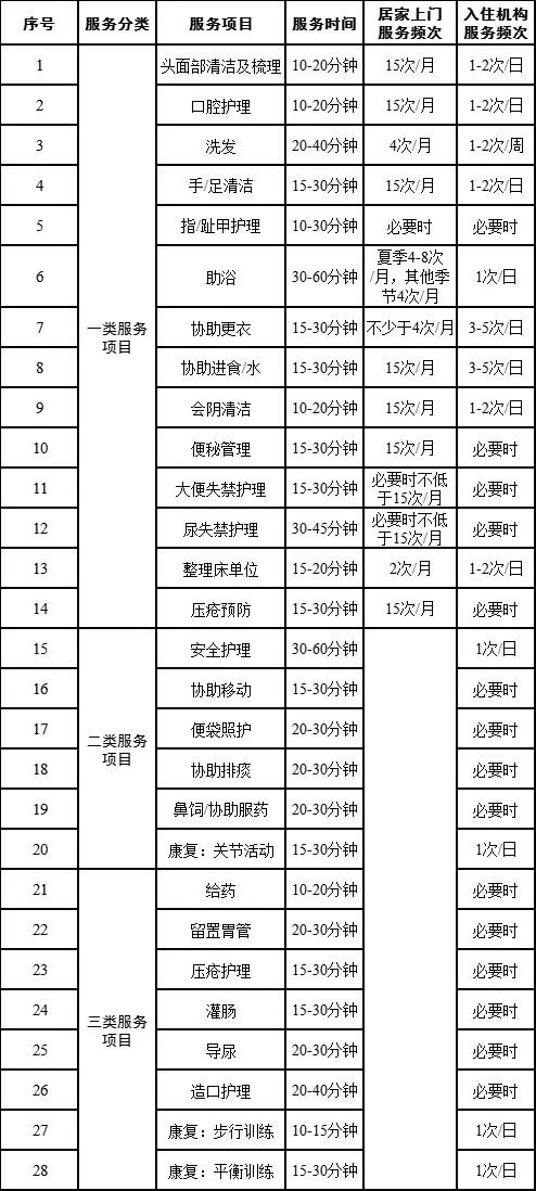 2.选择入住定点养老服务机构、残疾人托养机构的,定点养老、残疾人托养机构应为入住的失能人员完成一类和二类服务项目共20项。