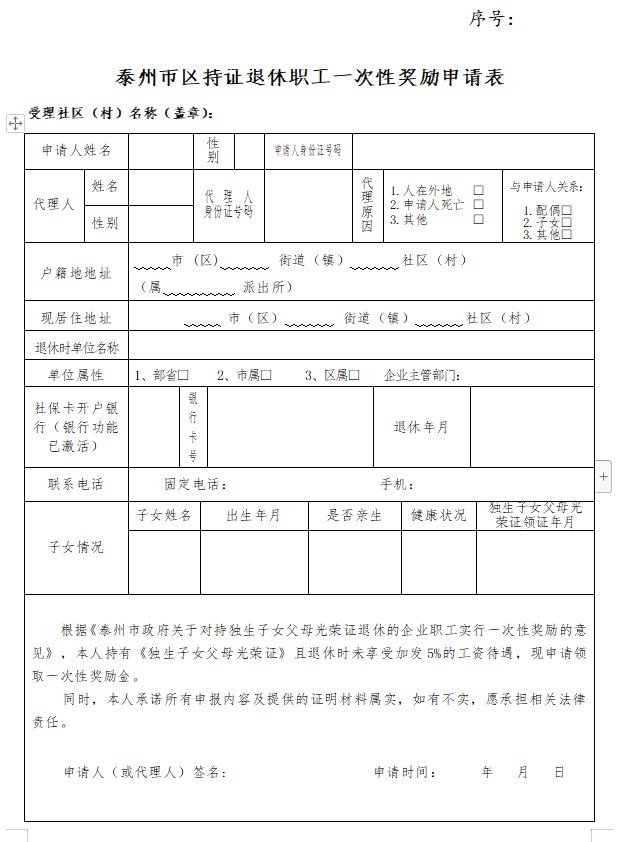 泰州市区持证退休职工一次性奖励申请表官网下载入口:点击进入