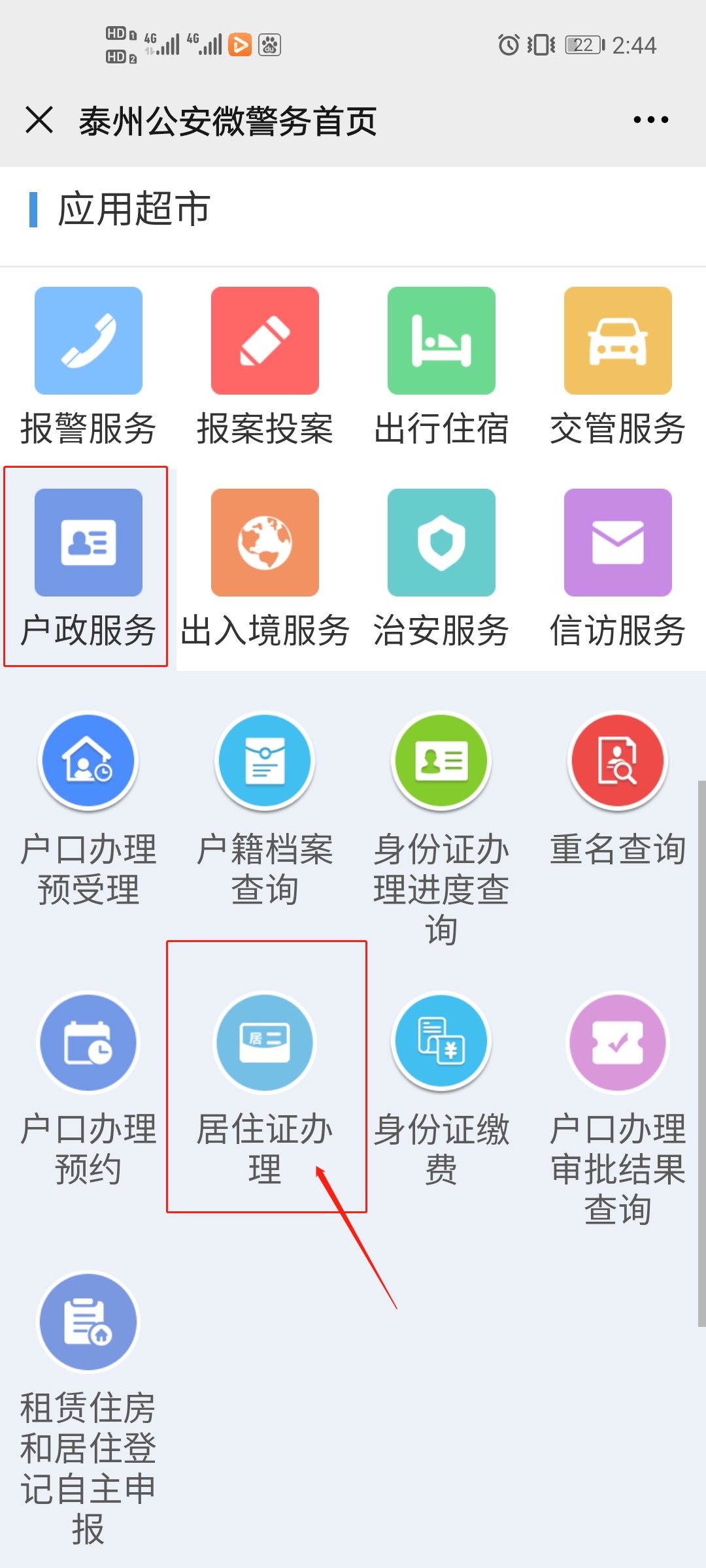 第一步:进入泰州公安微警务首页,点击【户政服务】—【居住证办理】