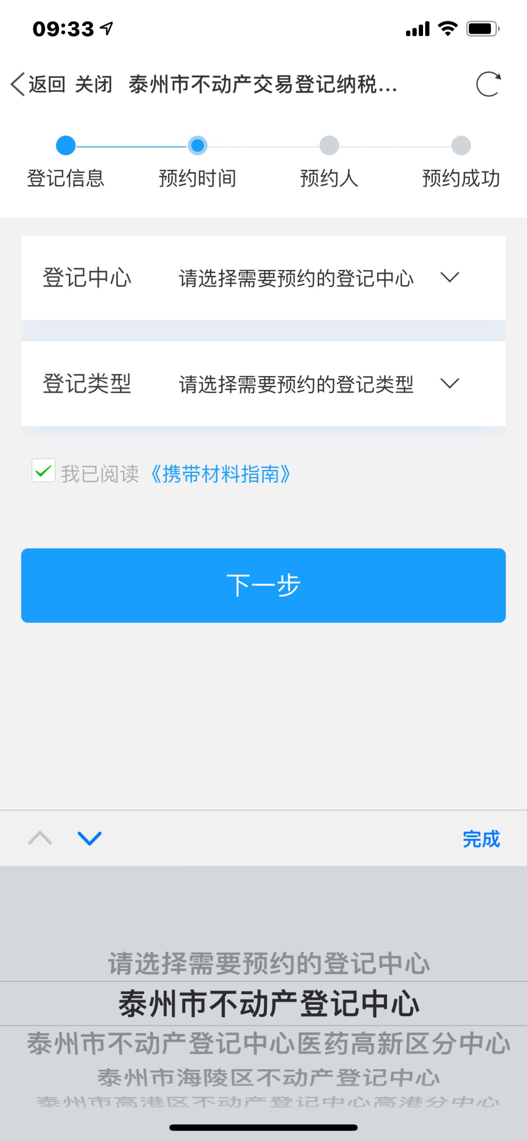 (五)选择登记中心和登记类型,点击下一步后确认自己的预约信息。