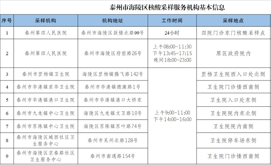 为进一步满足群众核酸检测需求,现将海陵区核酸采样检测服务机构,予以公布,请有需要的市民就近选择检测点,携带本人身份证(无身份证的儿童携带户口簿),做好个人防护,按预约时间进行采样,等待检测结果期间“非必要不外出”,不参加聚集性活动,做好个人健康监测,如有发热、咳嗽等症状,及时到医疗机构发热门诊就诊。