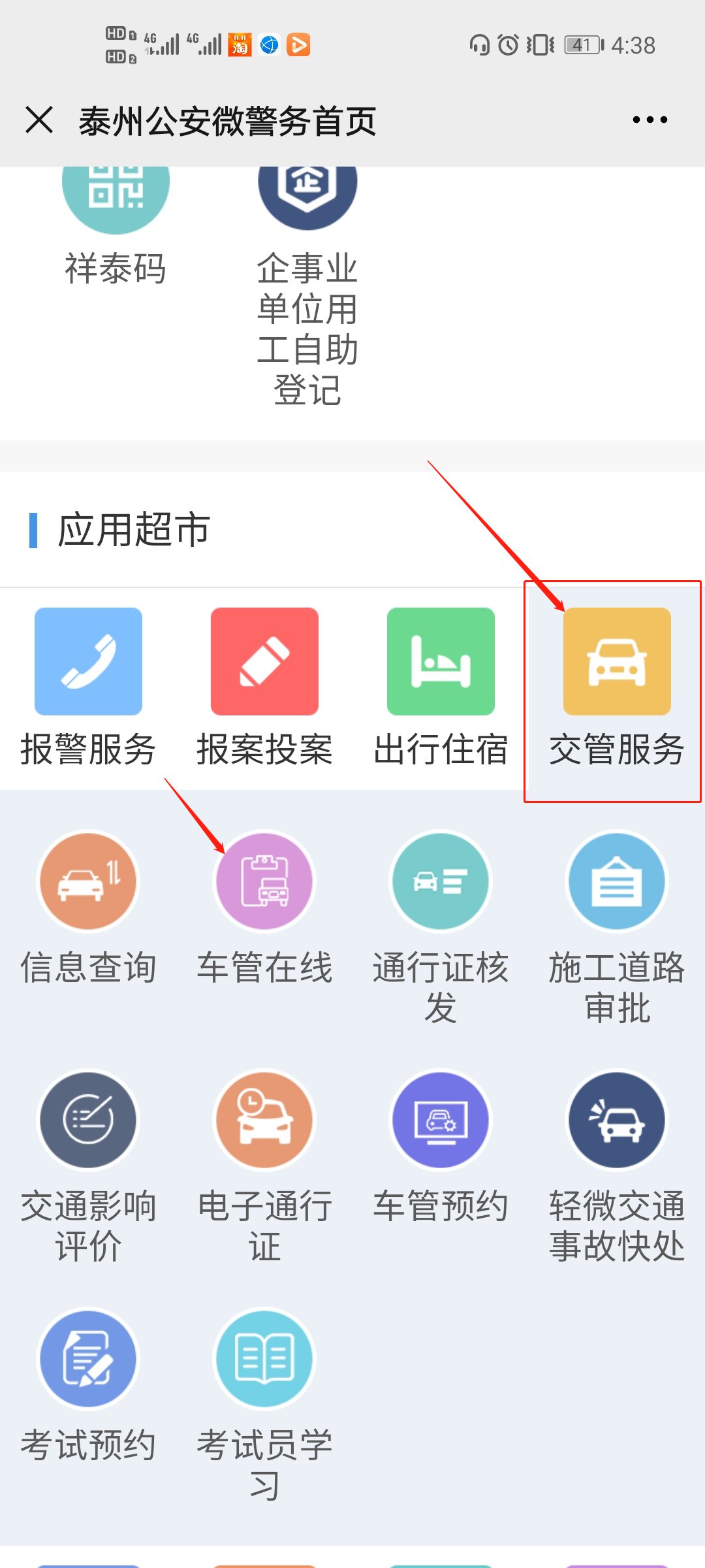 第一步:进入泰州公安微警务首页后,下拉选择“交管服务”,点击“车管在线”