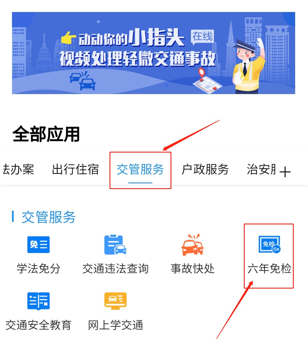第二步:下拉到全部应用的交管服务专栏,选择“六年免检”,点击进入,仔细阅读办理协议,点击“点击详细阅读,并同意该协议”