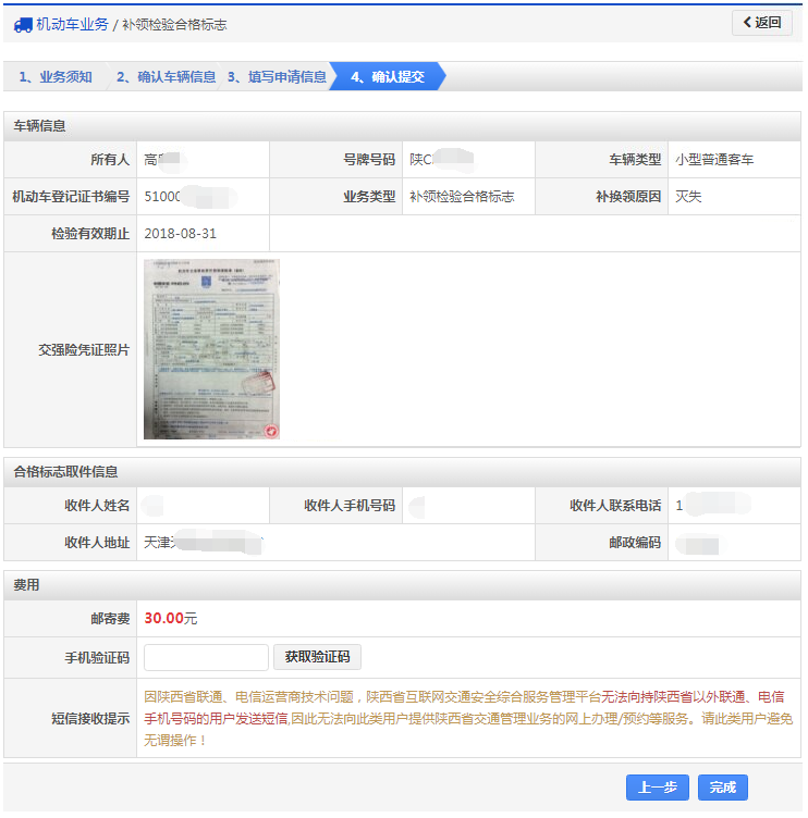 在该步骤,用户填写业务类型、申请原因、取件方式,对邮政寄递的选择邮寄地址,窗口自取的选择自取车管所等资料信息。如下图所示,确认后点击【下一步】按钮进入步骤4【确认提交】。