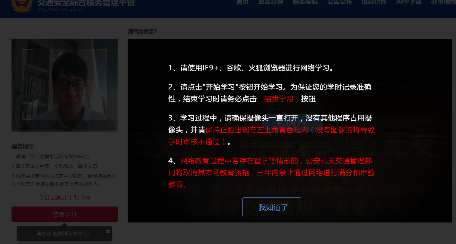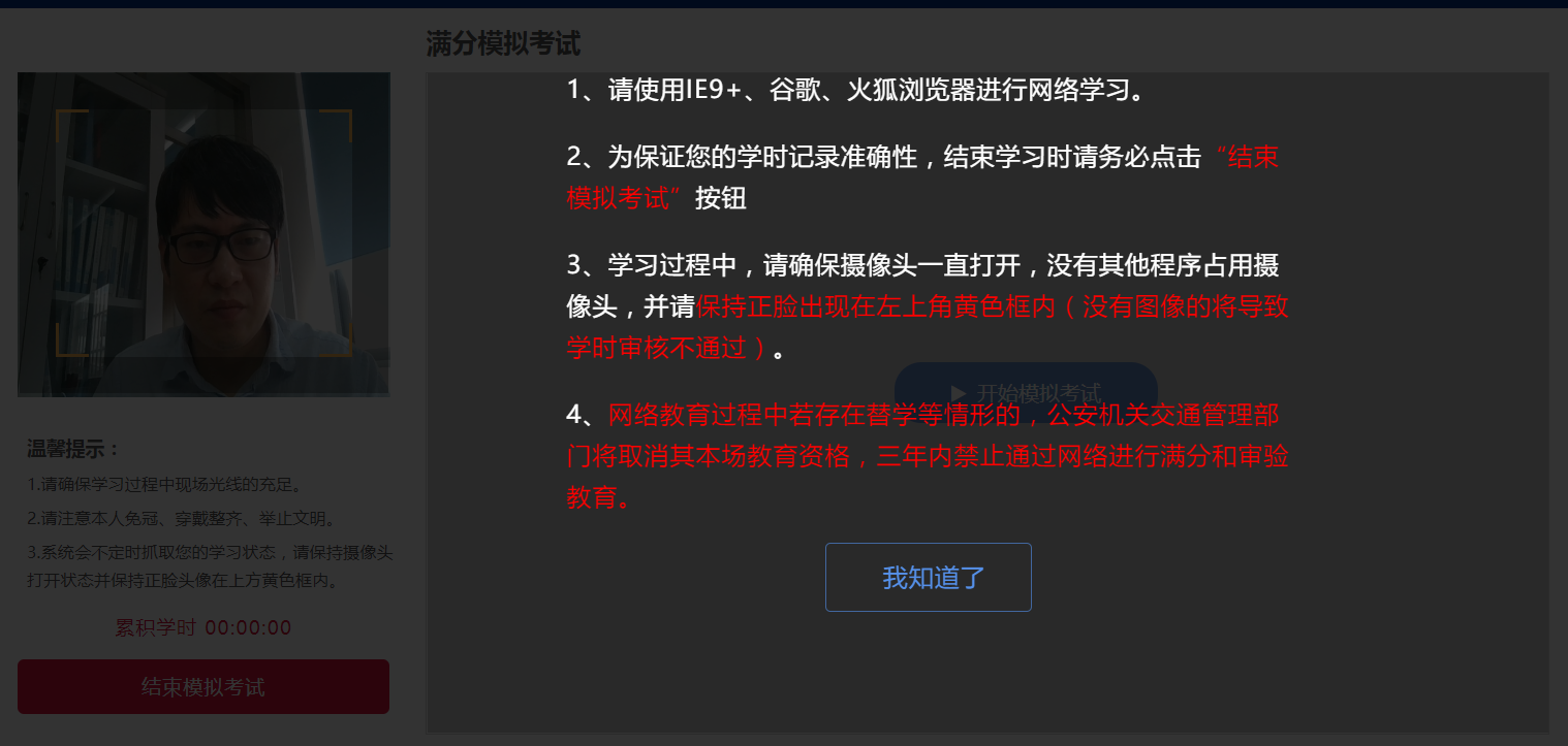 (3)学习过程中,存在替学情形的,公安机关交通管理部门将取消您教育资格,三年内禁止通过网络进行满分和审验教育。存在瞌睡、做与学习无关之事、离开等不认真学习情形的,学习记录将审核不通过,学习时间作废。