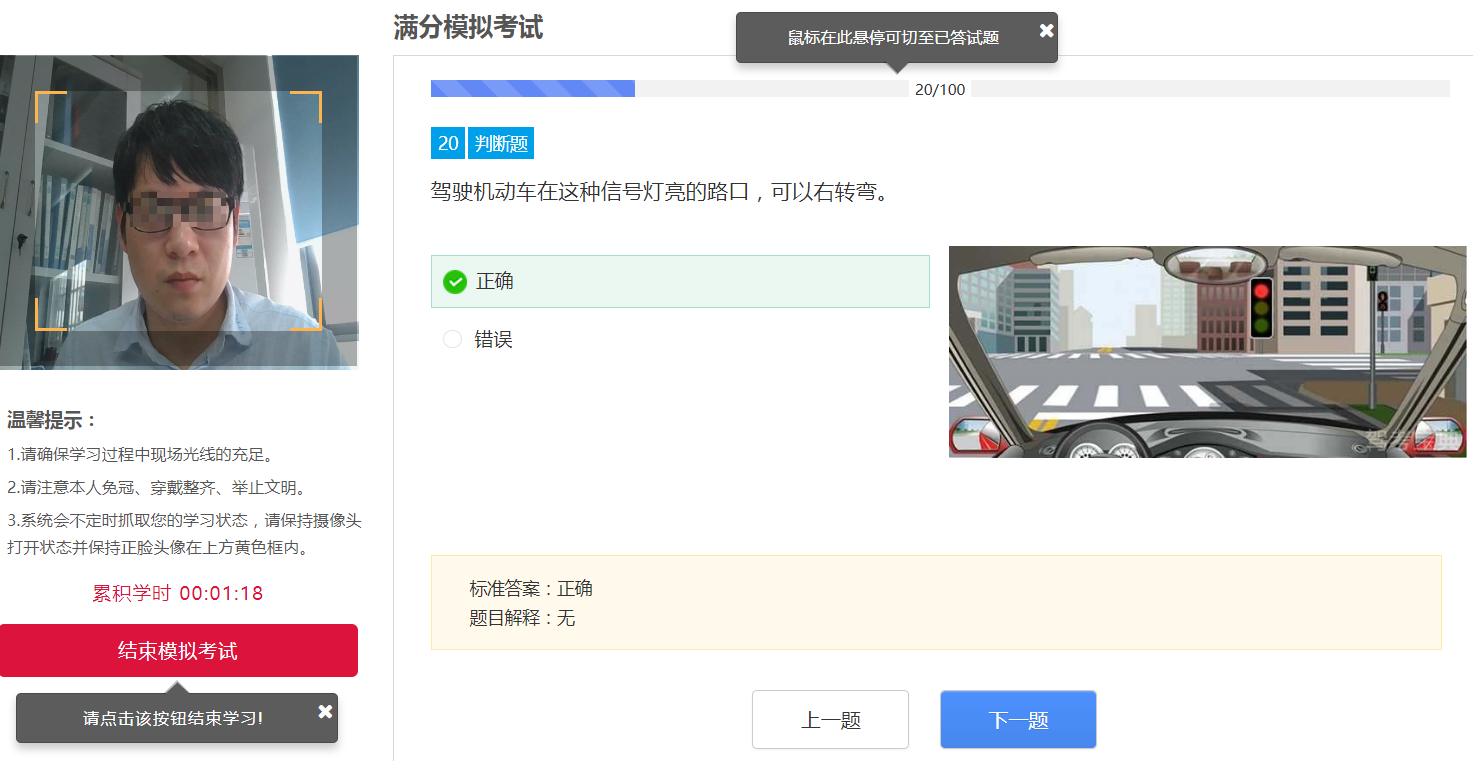 若右上方弹出打开摄像头提醒,请点击“允许”。等待左上角摄像头打开后,点击【开始模拟考试】进入步骤3,同时系统开始计时,操作界面如下图所示: