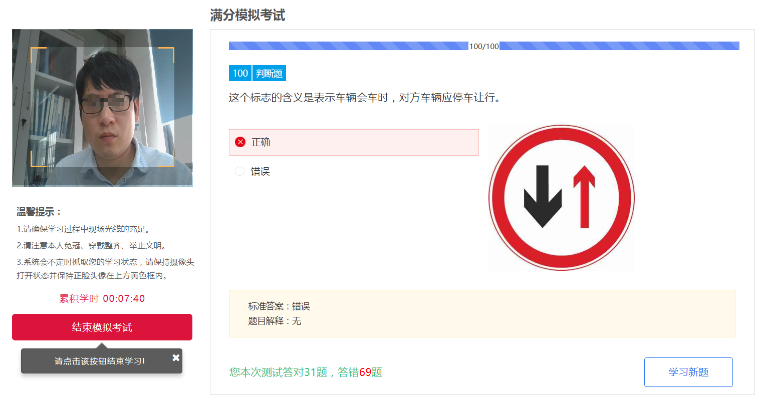 学习结束时,点击【结束模拟考试】,系统停止计时并告知测试结果。也可以点击"学习新题",重新开始练习。