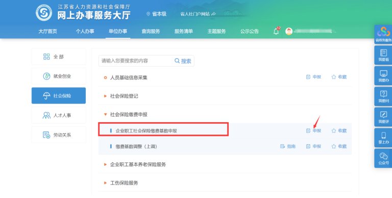 请使用谷歌浏览器,单位登录进网上办事大厅后,点击单位办事→社会保险→社会保险缴费申报→企业职工社会保险缴费基数申报,点击申报。仅此一个模块用于申报。
