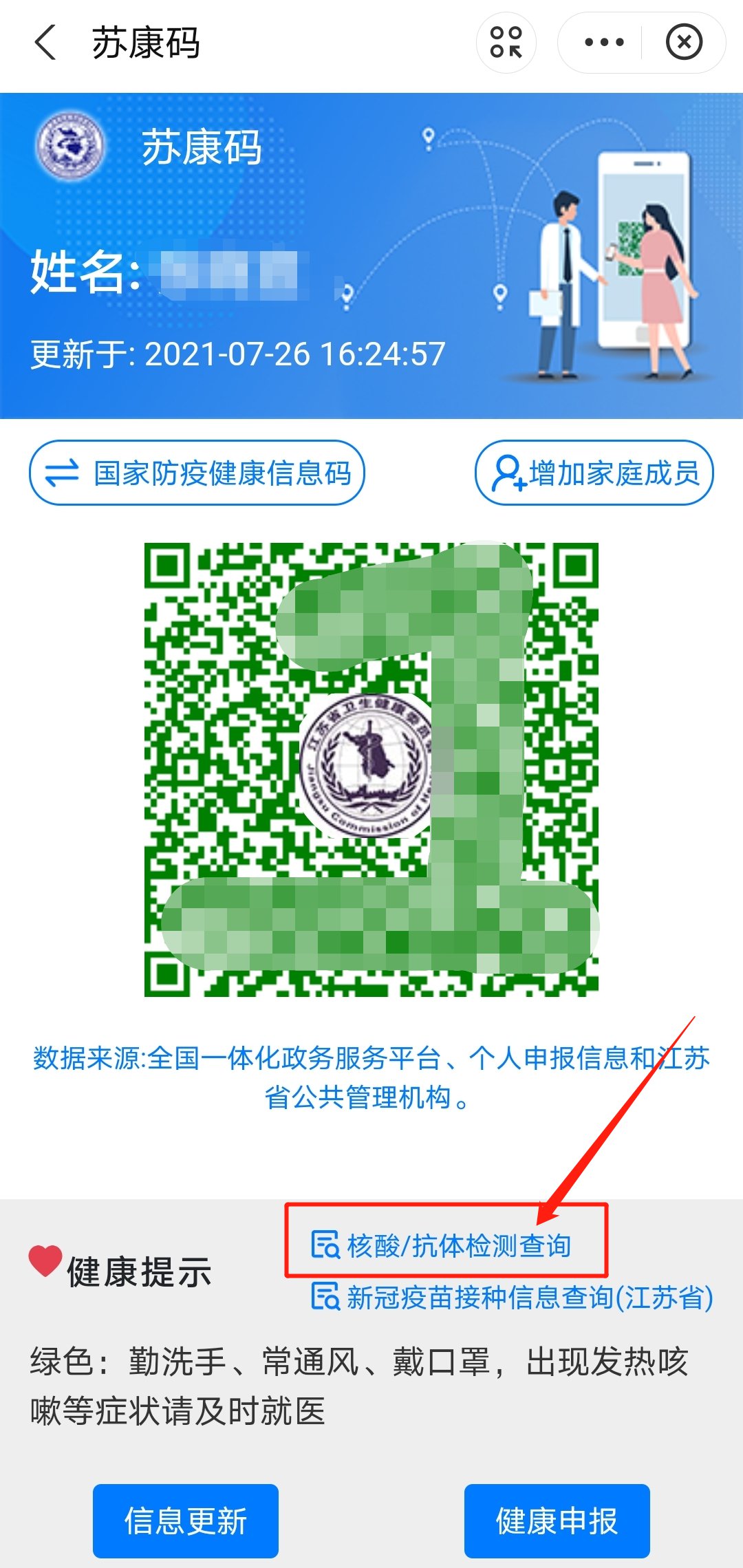 进入“苏康码”申领页面后,点击右下方的“核酸/抗体检测查询”: