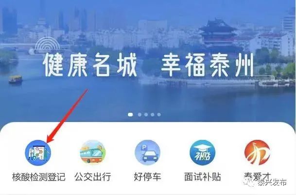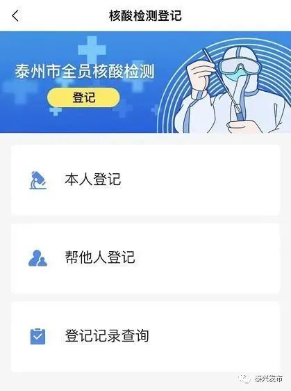 点击首页菜单中的“核酸检测登记”,进入“泰州市全员核酸检测登记”服务。