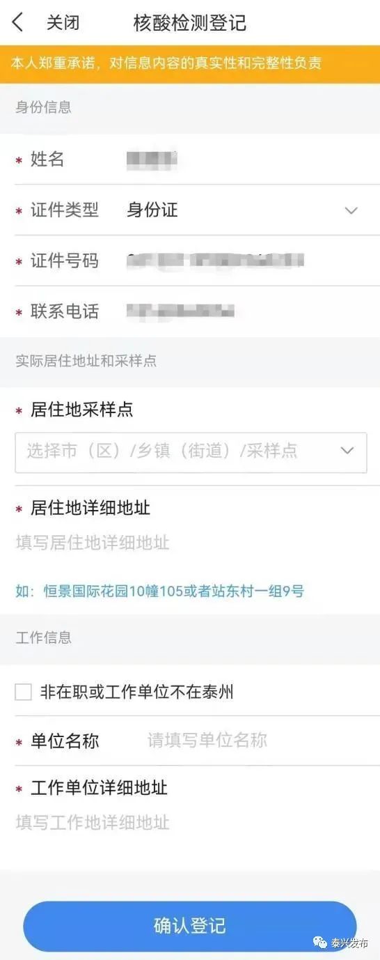 (1)本人登记。本人姓名、证件类型、证件号码等信息自动带入。选择市(区)/乡镇(街道)/采样点,填写“居住地详细地址”。填写“单位名称”及“工作单位详细地址”,如果非在职或工作单位不在泰州,勾选相关选项。
