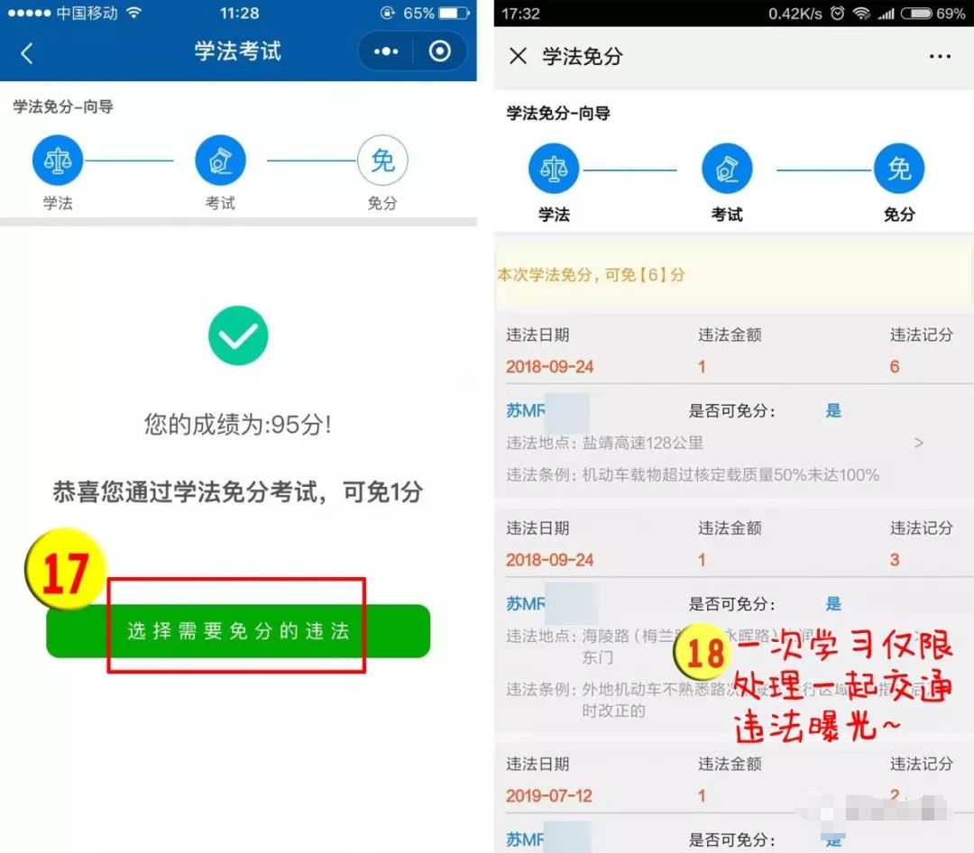用户通过考试后,可对交通违法进行处理缴款(目前只支持微信支付),1次考试合格可对一起记分分值为6分(含)以下未处理的交通违法曝光做免记分处理。