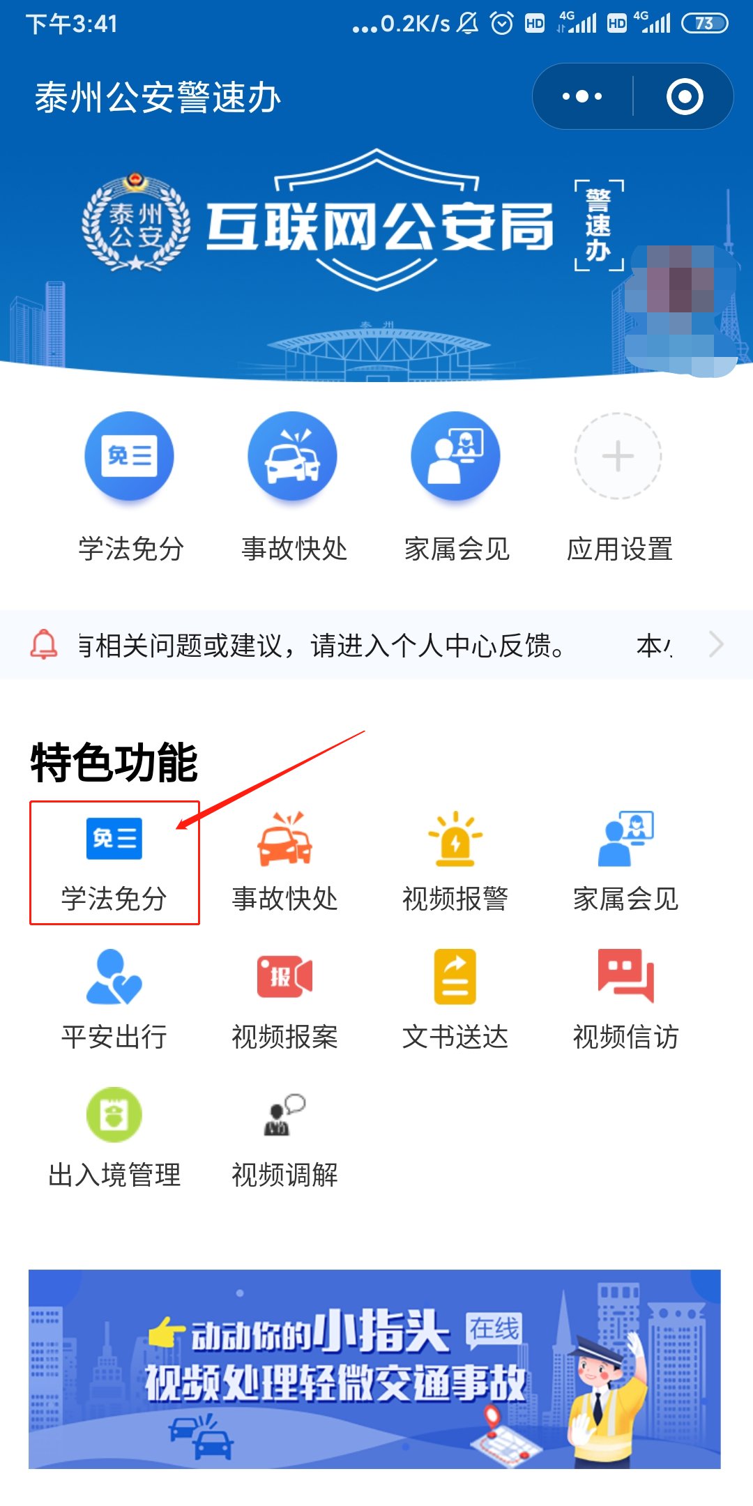 1、微信搜索“泰州公安警速办”小程序,进入首页,点击“学法免分”