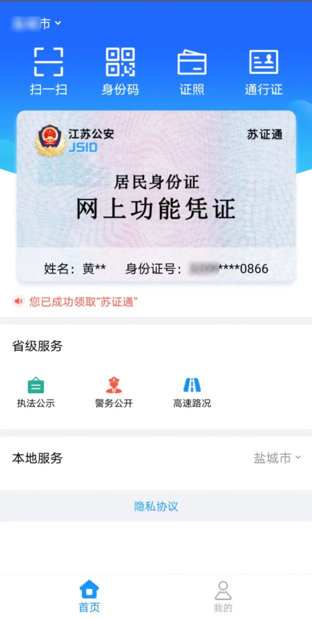 第二步:登录成功之后,会显示一张个人身份证,可供出示使用